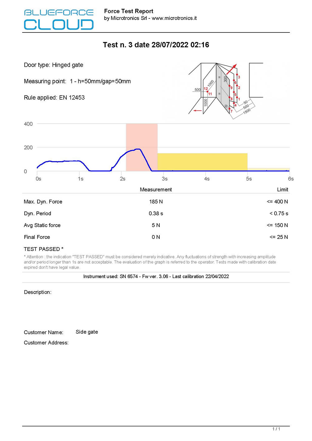 The BlueForce Smart PRO Tester 50V001G works seamlessly with the Microtronics “BlueForce CLOUD” portal, which captures all the measurements sent from the tester. The “BlueForce CLOUD” 50V024-G includes archiving of the force test measurements, report printing, compiling of the Risk Analysis and the Technical File (conforming to EN12453), storing of any photos and other documents and a timeframe maintenance log. The BlueForce CLOUD service is provided on an annual paid-for subscription valid for 12 months, and if you purchase a new Blueforce Smart PRO Kit or have your existing tester upgraded then the year’s subscription is included free of charge.
